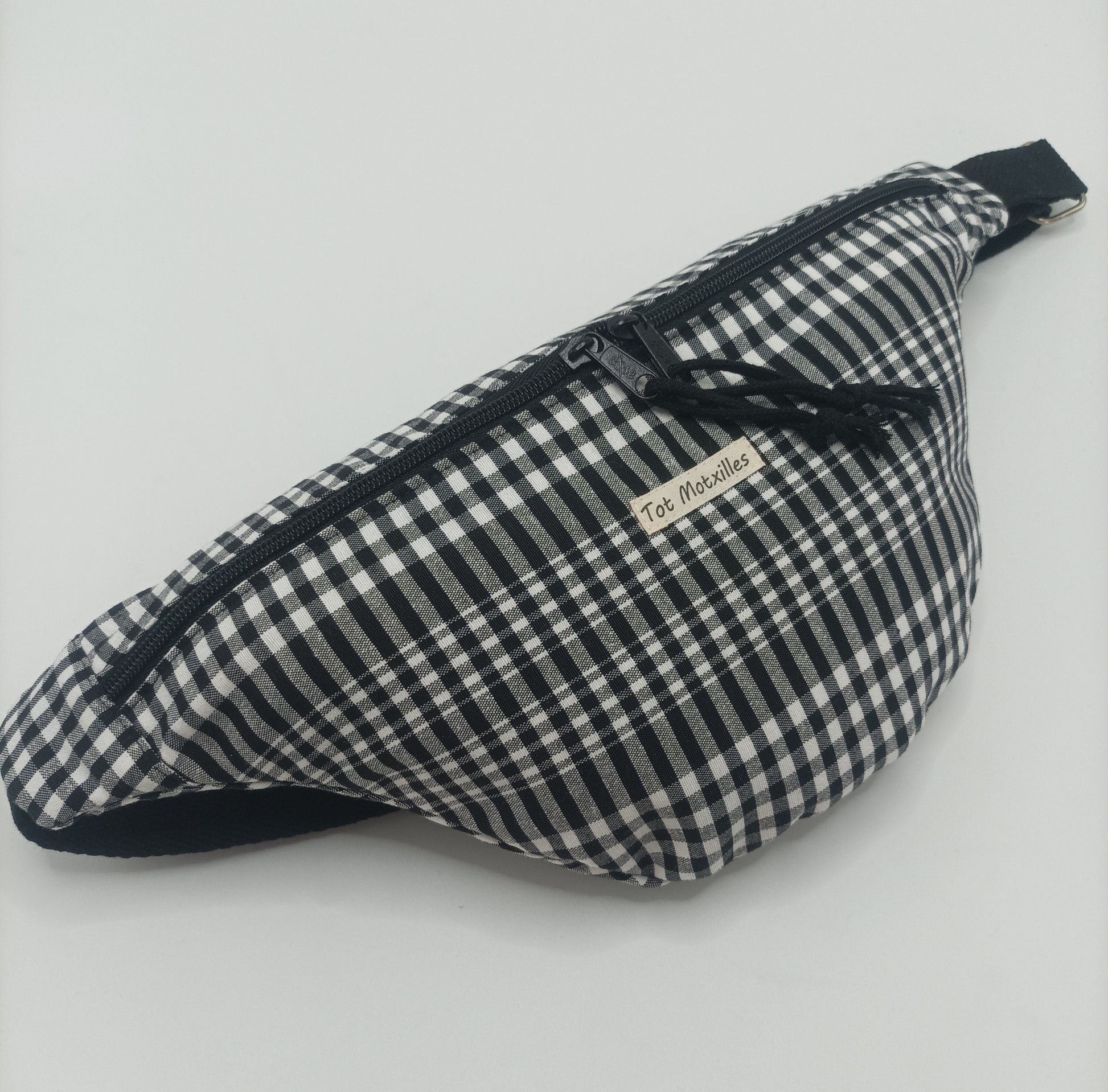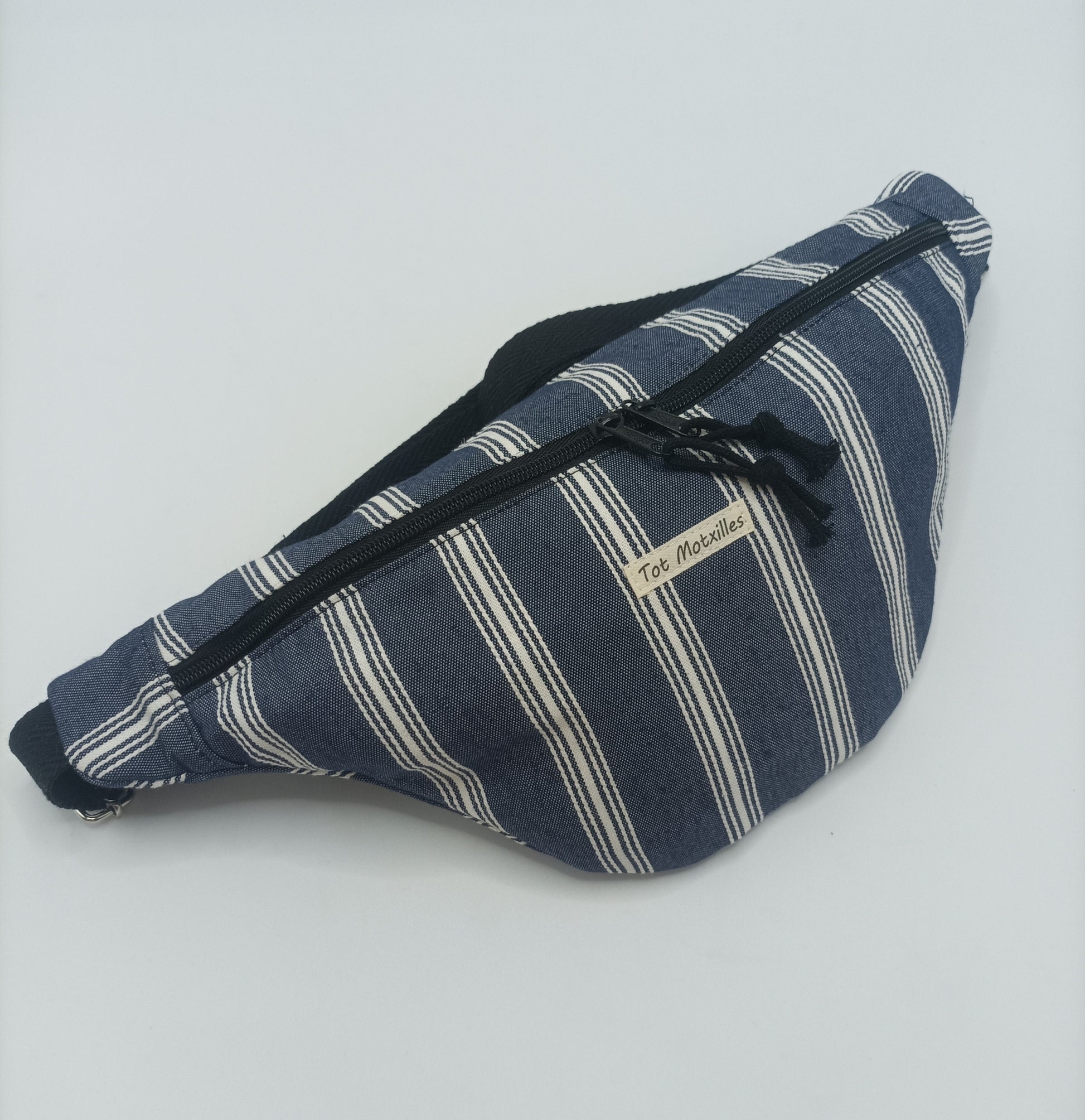 Bandolera unisex de tela de farcell marró, farcell blanc i negre, farcell blau, farcell groc, farcell gris, farcell verd i ratlles blanques i blaves. Aquest model és de forma més allargada. Folrada i amb ansa de cotó regulable