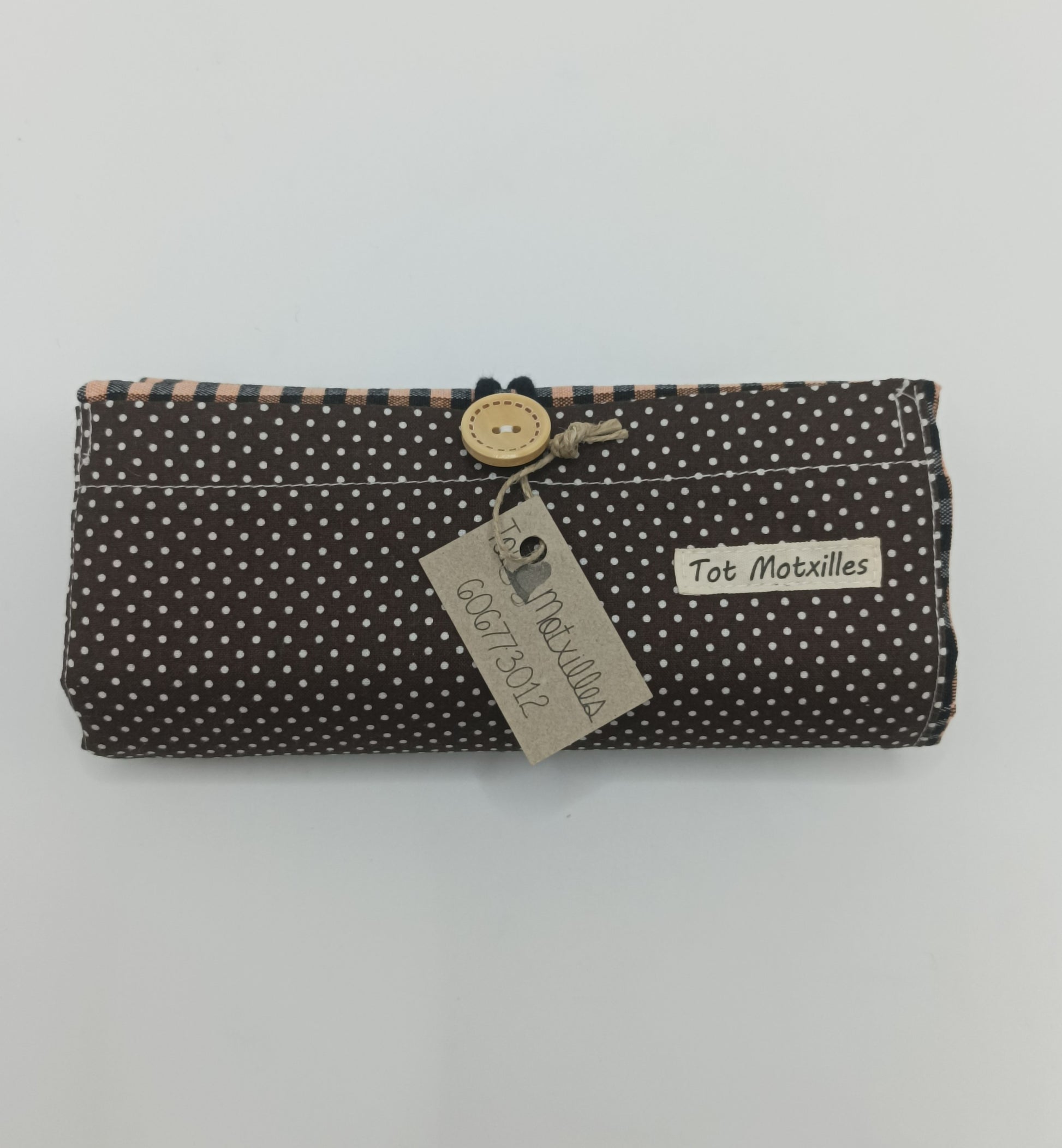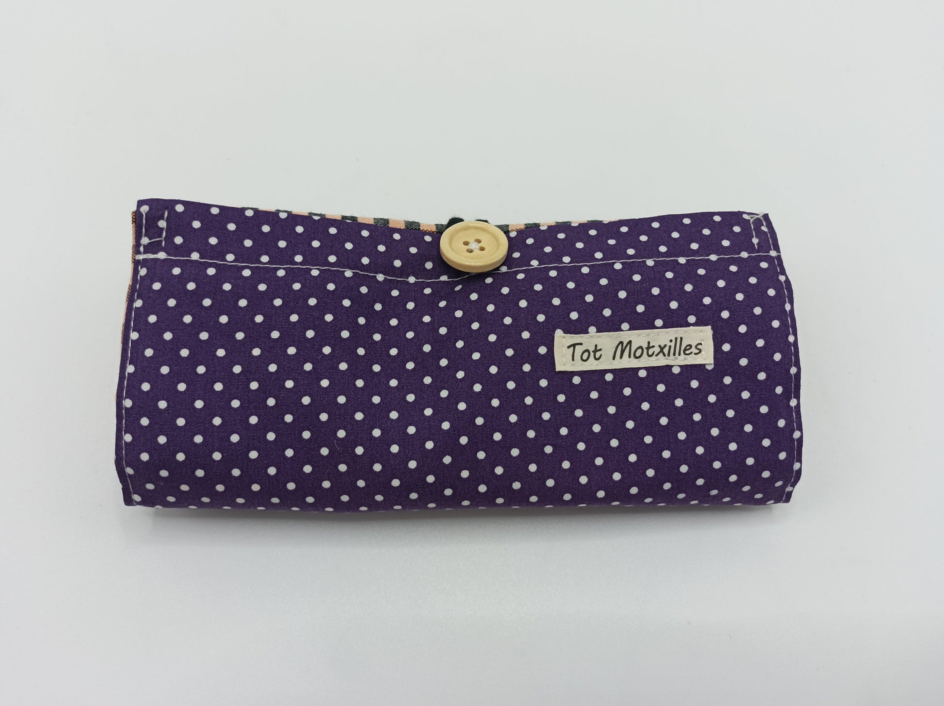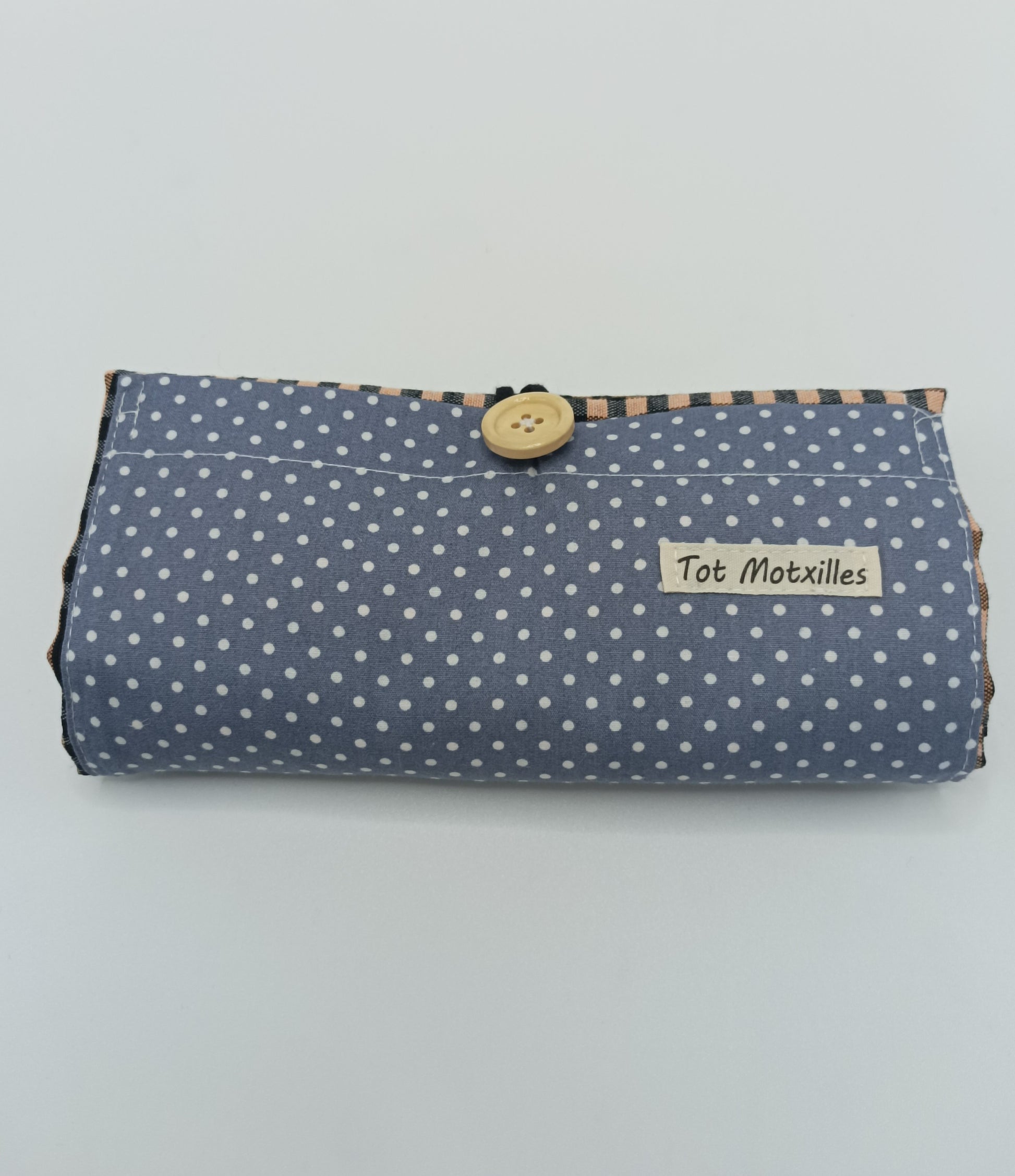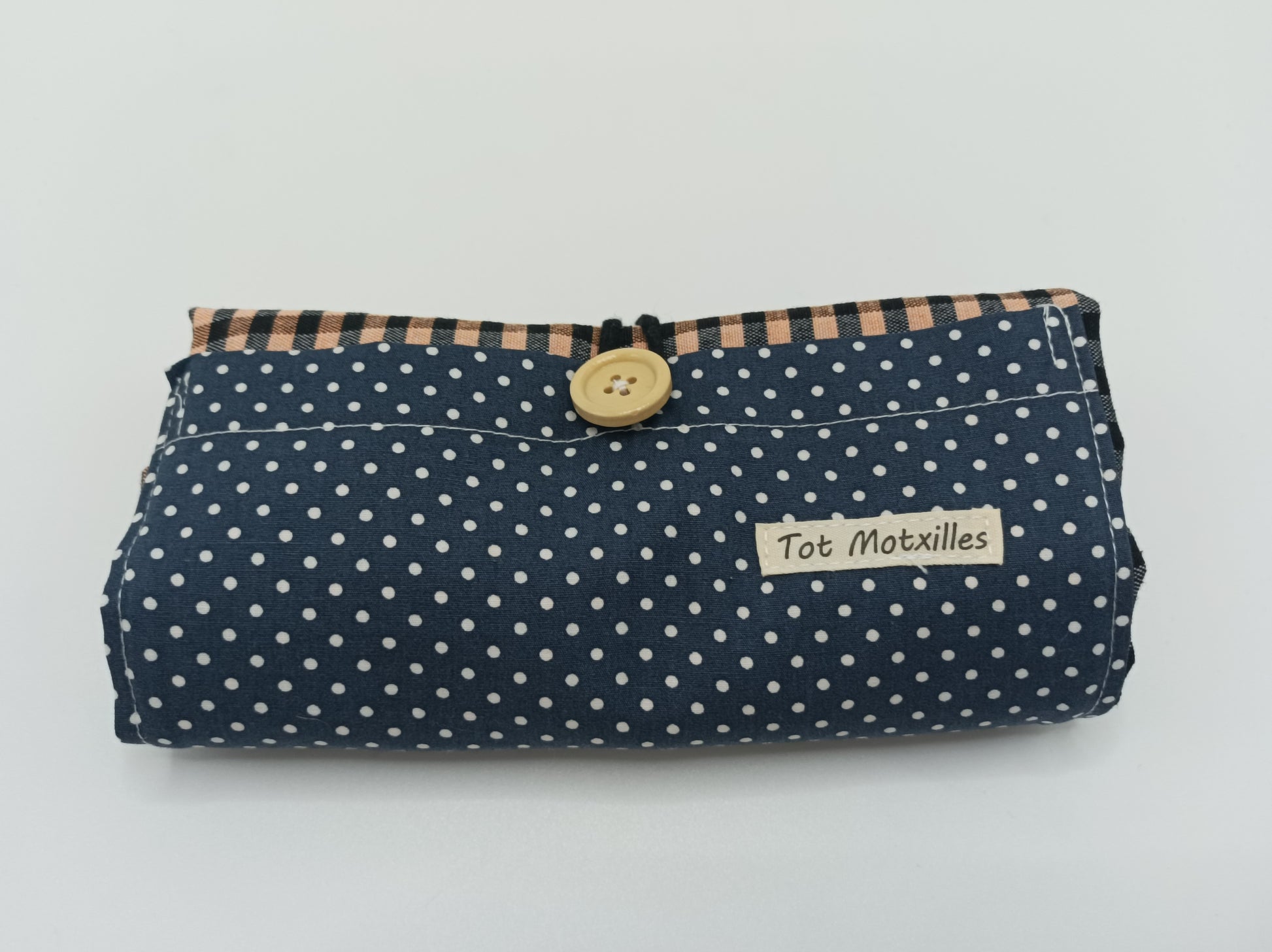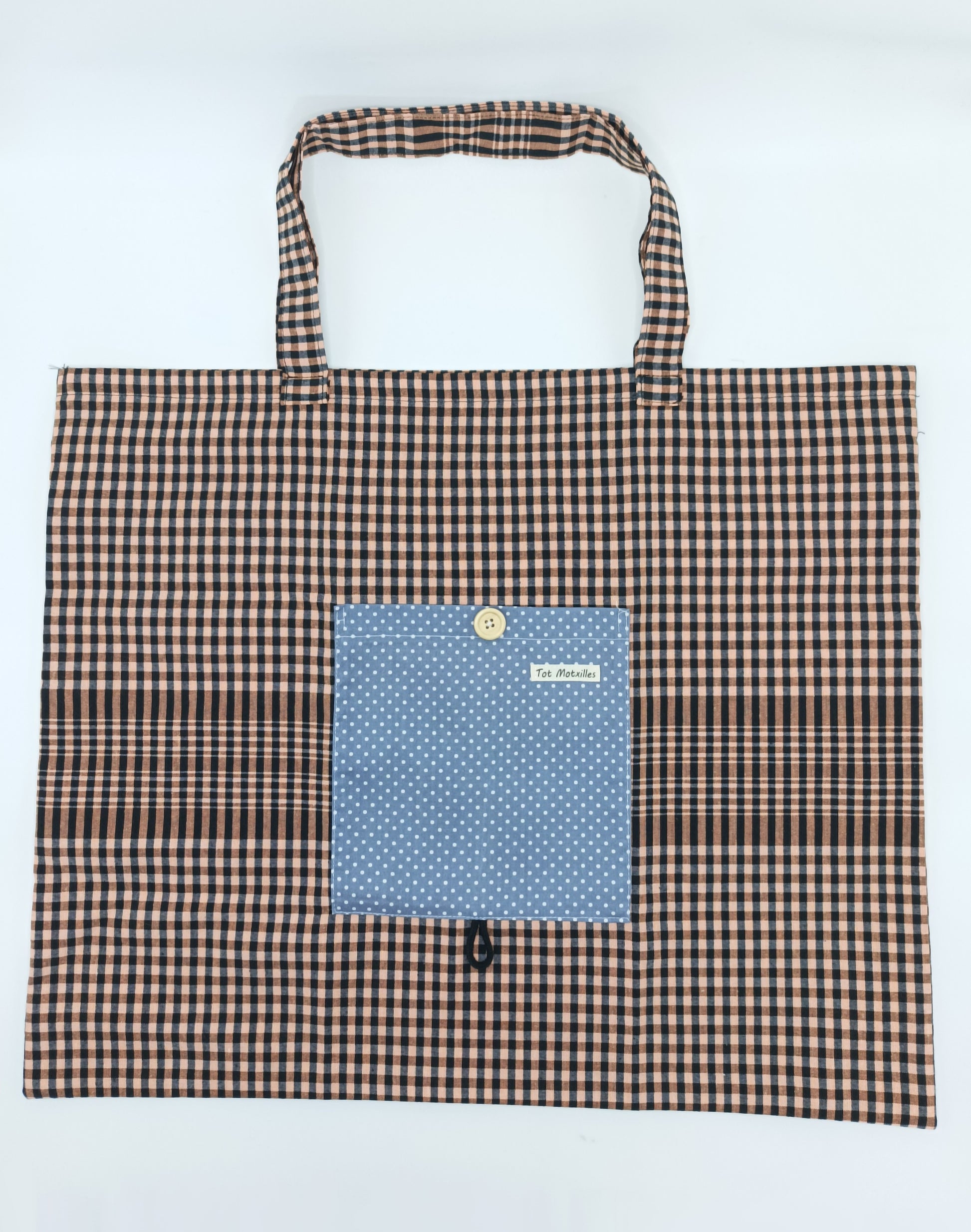 Compta amb una butxaca exterior d'estampat de piquets per a guardar petits objectes i un botó que permet doblegar-la fàcilment i mantenir-la compacta quan no s'usa.